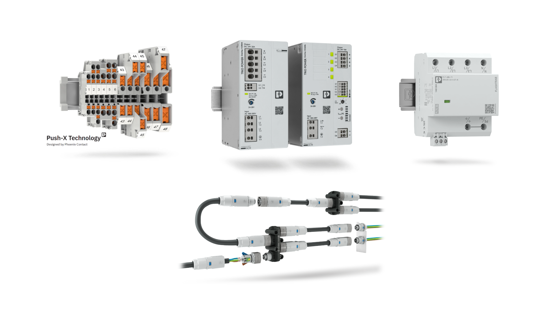(写真左より:Push-Xテクノロジ端子台XT端子台、電子式サーキットブレーカ付き電源 TRIO、新カーボンスパークギャップ式SPD FLT-MB、防水防塵電源中継コネクタ )