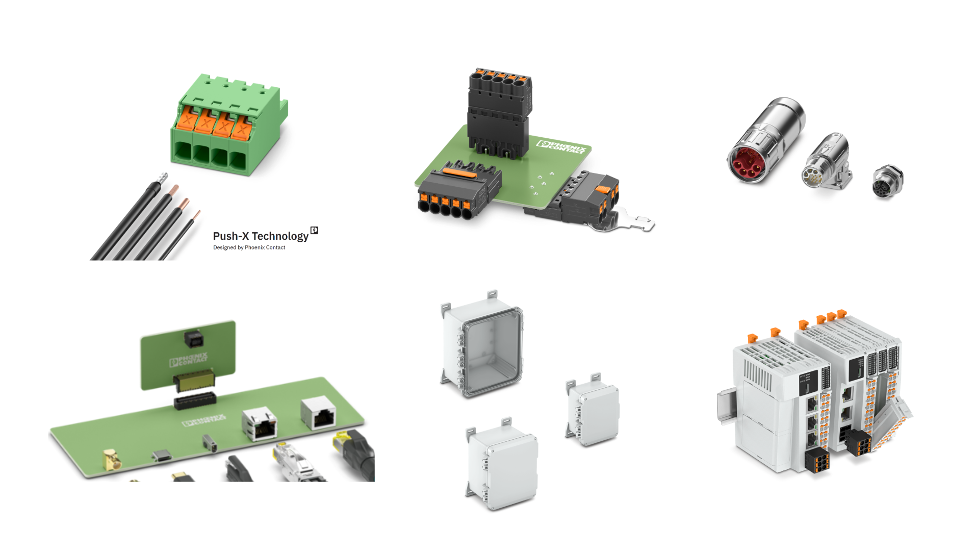 (写真左より:Push-Xプリント基板用コネクタ XPC 2,5、コンパクトな電源用コネクタ SPC 4、金属製丸型ハイブリッドコネクタ、高速DATA通信コネクタ、屋外用ケースシステム OCS、IO機器用多機能ケースME-IO-Slim)