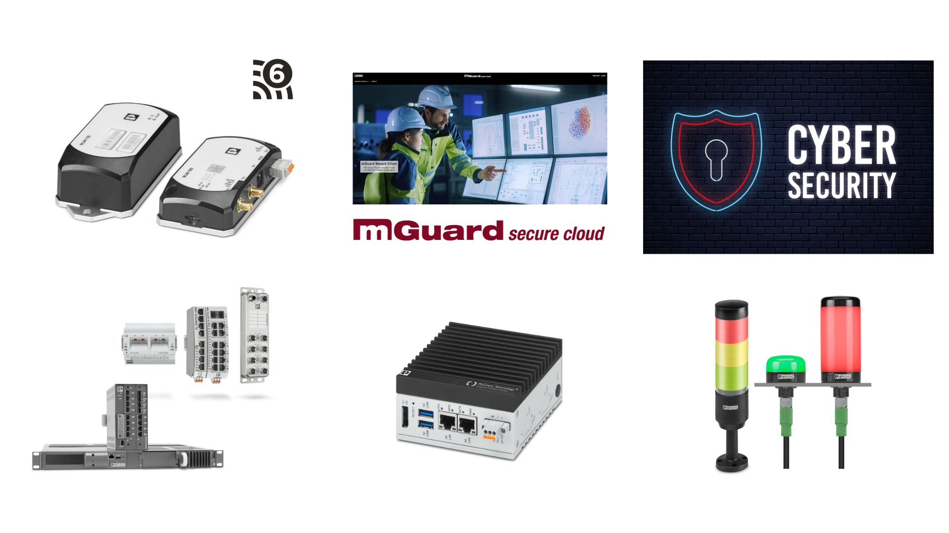 (写真左より:Wi-Fi 6 産業用無線 LAN アダプタ FL WLAN シリーズ、リモートアクセス用クラウド mGuard Secure Cloud、サイバーセキュリティ、スイッチングハブ FL SWITCHシリーズ、Virtual PLCnext Control、Ubunto PRO搭載小型エッジPC VL3 UPC 2440 EDGE、信号灯PSD-SL, PSD-SC)
