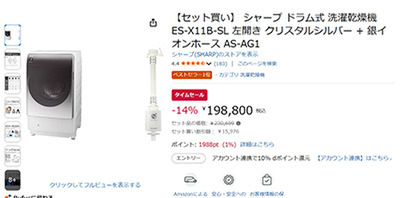 SHARP(シャープ)のドラム式 洗濯乾燥機「ES-X11B-SL」と、銀イオンホース「AS-AG1」の特別セットがAmazonタイムセールに登場しました。