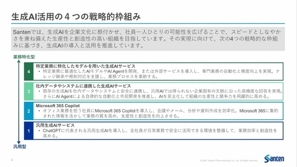 まず、最初の段階では、ChatGPTに代表される「汎用的な生成AI」を全社員に導入し、日常業務で安全に活用できる環境を整備する。これは、2024年度に完了したという。