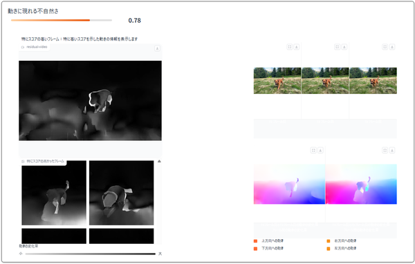 「動きに表れる不自然さ」の検出機能は、動画の各フレーム間の差分を利用し、動きの微細な不自然さを検出する機能。従来の検出モデルに加えて、動きの不自然さという検出視点を持つモデルを追加し、検出モデルの多重化を強化。これにより従来よりも巧妙なフェイク動画に対する検出力の強化を実現したという。