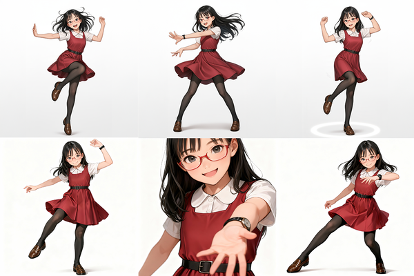 Seedreamの方がイラスト的な雰囲気の品質が高いものになるため、Seedreamでもプロンプトを工夫しながら作っていきます。ダンス動画は、全身像だけでは退屈な動画になるとことを経験的に知っているため、アップになっている画像も作成しました。そして、その中から使えそうなものをピックアップします。また、円形の回転型LEDディスプレーに合うように、画像は正方形で作成します。