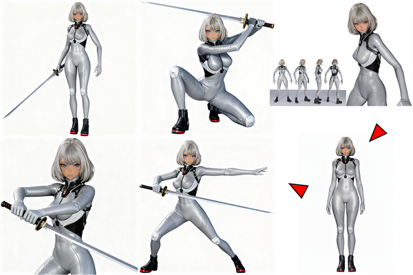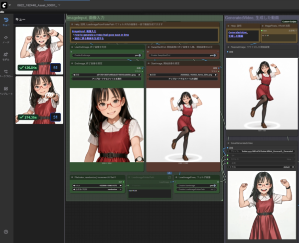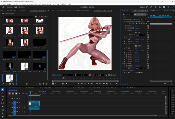 もう1人のヒロインのセレナは、「剣を持ったポーズ」をとらせ、より3D的な質感を出すようにしました。元々の画像では持っていなかった剣を持つように指示して、様々なポーズのバリエーションを同じように出しました。そこでキレイに作れた画像をベースに動画にしています。ただ、動画になると、剣を持つ手の動きが若干怪しいですが、イベントで展示する動画としてはこれで十分と考えました。これもやはり「Wan 2.2」で動画化して、Adobe Premiere Proで結合させて、背景を削除という順番で完成させています。