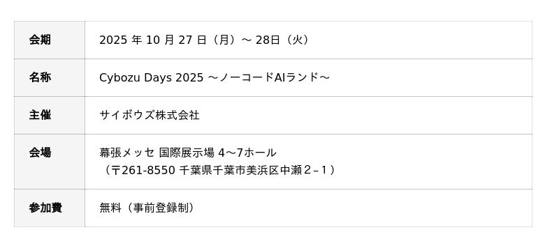 詳細情報は、公式ウェブサイト(https://days.cybozu.co.jp/)からご確認いただけます。