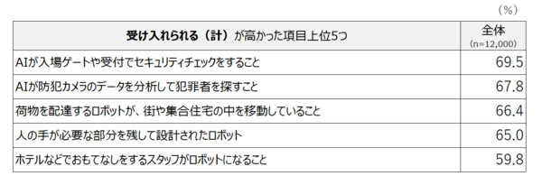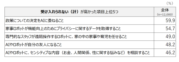 一方で「政策についての決定をAIに委ねること」「家事ロボットが機能向上のためにプライバシーに関するデータを習得すること」などでは「受け入れられない(計)」という回答が高くなっている。