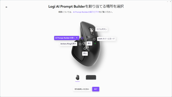 例えば、「ジェスチャー」ボタンに「Logi AI Prompt Builder」を割り当てれば、ボタン1つでAI機能が使えるようになるわけだ。