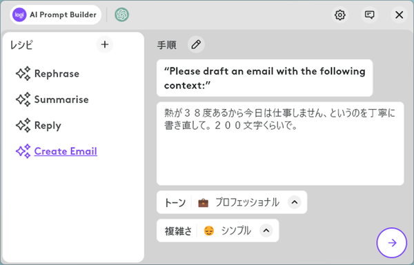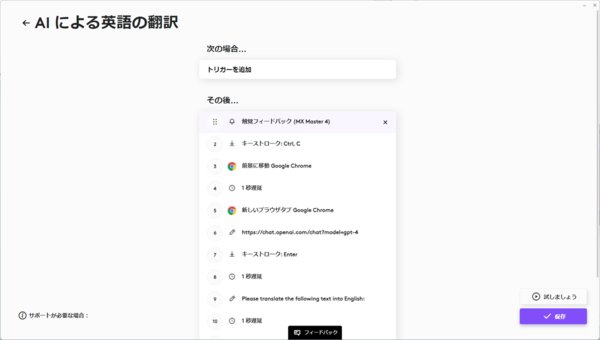 「Logi Options+」ではAI機能を手軽に使うための機能が用意されており、それが、「Logi AI Prompt Builder」だ。これは、事前に用意したプロンプトを“レシピ”として登録しておけるもので、同じような作業を何度も行う場合などに活躍してくれる。