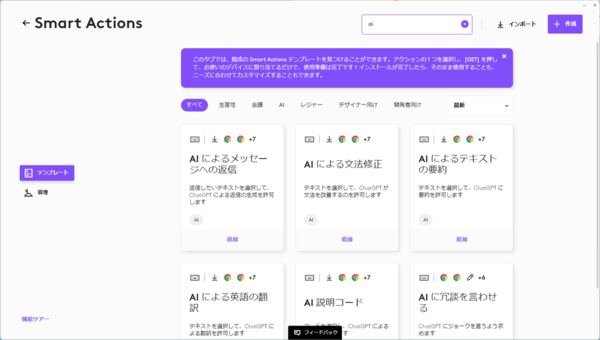 ちなみに、AI機能との連携をさらに強化したいなら、マクロ機能の「Smart Actions」を活用するのがオススメだ。返信の生成や要約、翻訳など、テンプレートがいくつか用意されているので、これを参考にするとわかりやすい。