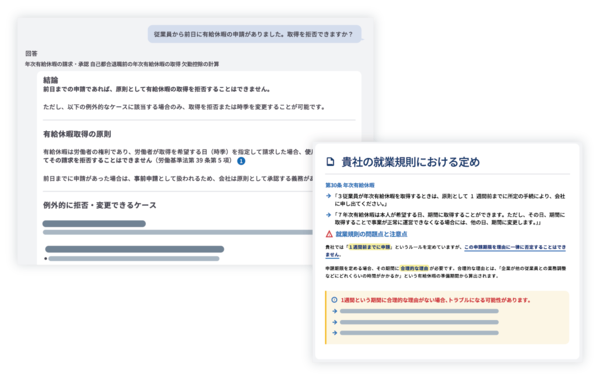 例えば、「年次有給休暇の付与」について質問した場合、これまでは、分割付与を実施している会社においても「入社6ヶ月後に10日付与されます」といった法定基準どおりの回答が提示されていたという。これがアップデート後は、「貴社の就業規則第○条によれば、正社員の場合、入社時に5日が付与され、入社6ヶ月後に5日が付与されます。また、以降は入社日を基準日として付与されます」というように、その会社の規程に即した回答が得られるようになるとのこと。