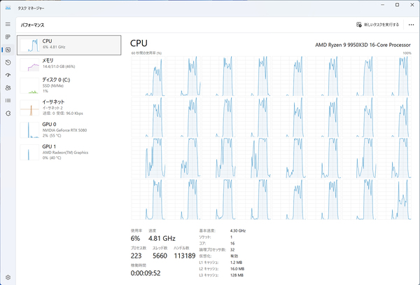 | CPU | AMD「Ryzen 9 9950X3D」 (16コア/32スレッド、最大5.7GHz、TDP170W) |