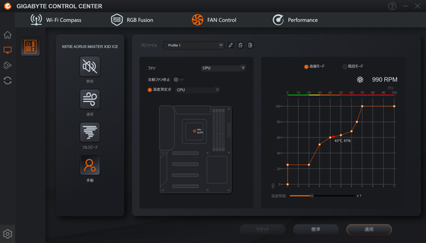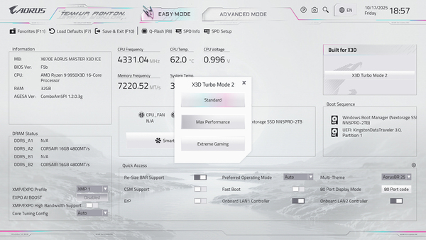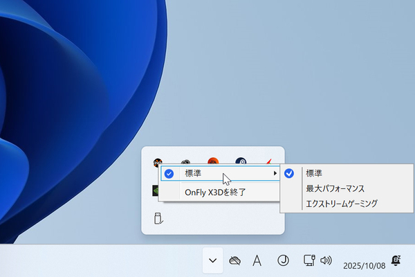 BIOS(EASY MODE)の「Built for X3D」、またはWindowsユーティリティGIGABYTE「OnFly X3D」で設定でき、モード切り替えごとに再起動が必要となっている。