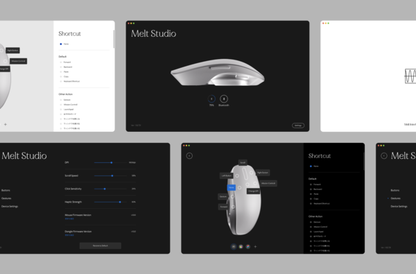 専用アプリ「Melt Studio」を使えば、スクロールのノッチ感のオン/オフ、ジェスチャーのショートカット設定などを自在にカスタマイズできる。PhotoshopやBlenderなど用途ごとのプロファイルを保存し、ワンクリックで切り替えられるのも便利だ。