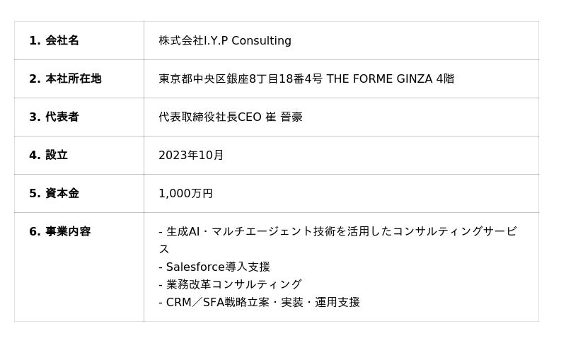 株式会社I.Y.P Consultingは、Salesforceを中心としたCRM/SFA導入支援や業務改革コンサルティングを、戦略立案から実装・運用まで一貫して提供するコンサルティングファームです。2025年9月より、生成AI・マルチエージェント・データ利活用を中核とした技術戦略を強化し、「End-to-End伴走型支援」を通じてクライアントの競争力と社会的価値の向上を支援しています。