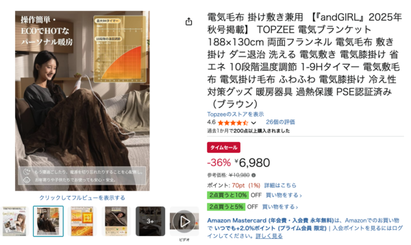 寒い季節の必需品、Topzee(トップジー)の電気毛布がAmazonタイムセールに登場。今なら参考価格より36%OFFの6,980円で購入できます。