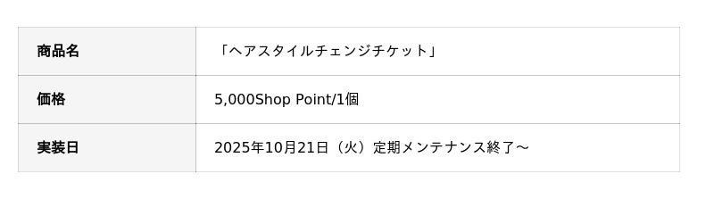 同時に、新ヘアスタイルへと変更することができる「ヘアスタイルチェンジチケット」をスペシャルアイテムショップにて販売開始です。