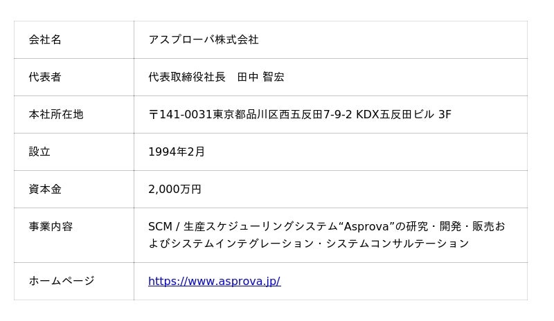 Asprovaは、1994年にアスプローバ社が開発した生産スケジューラです。多品種多工程の生産計画を超高速に作成し、工場の各設備や人員のスケジュールを秒単位の精度で作成し、実行可能な作業指示を計算してガントチャートで出力します。発売以来、国内外の幅広い製造業で採用され、順調に導入・利用社数を拡大しています。今後も生産スケジューリングのデジタライゼーションを支えるプラットフォームとして、機能とサービスの拡充を図ってまいります。(https://www.asprova.jp/products/overview.html)