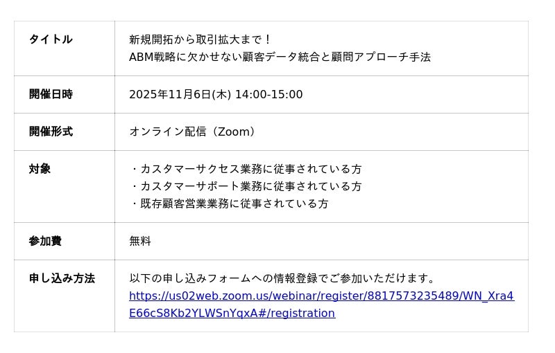ABM戦略を進める上で欠かせないのは、データに基づく精緻なアプローチと、信頼できる人脈からの突破口。 本ウェビナーでは、顧客データ統合によるデータドリブンなアクション設計と、顧問の紹介による新規部署・グループ企業への開拓手法をお届けします。 営業・CS部門が抱える「リードを増やしても接点が広がらない」「新しい部署へ入り込めない」といった課題に、実践的な解決策を組織運営にお役立てください。