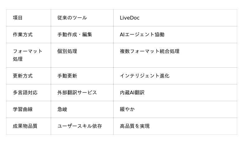 従来のツールでは複数プラットフォーム間でのインポート・エクスポート、コピー&ペーストの繰り返しが必要でしたが、LiveDocではこれらのプロセスすべてが一つのWebページ内で完結します。直感的なインターフェース設計により、ほとんどのユーザーは30分以内に基本操作を習得できます。