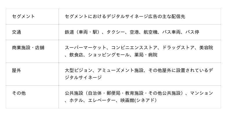 本調査では、デジタルサイネージ広告を、交通機関/商業施設・店舗/屋外(OOH)/その他の4つに分類し、2025年の推計と、2030年までの予測を行った。