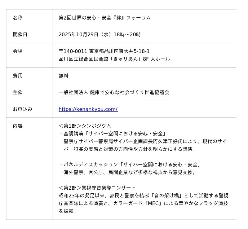サイバー犯罪が深刻化する中、当協議会では「健康で安心な社会づくり」を活動目的に掲げ、官民連携による犯罪抑止を目指す取り組みとして、本フォーラムを開催いたします。