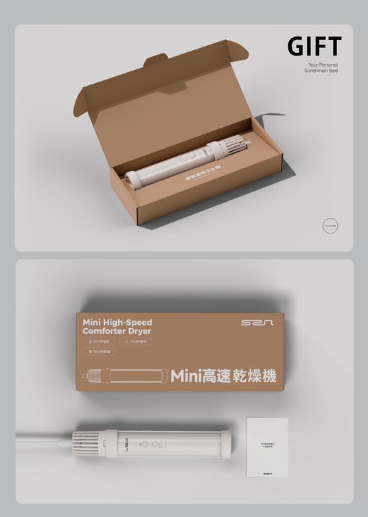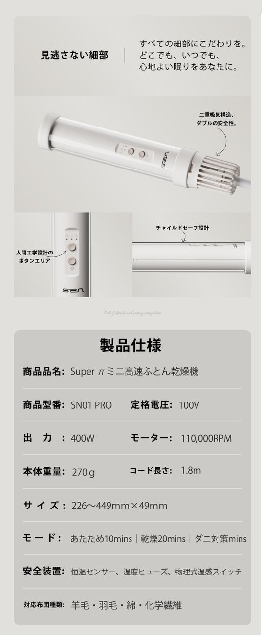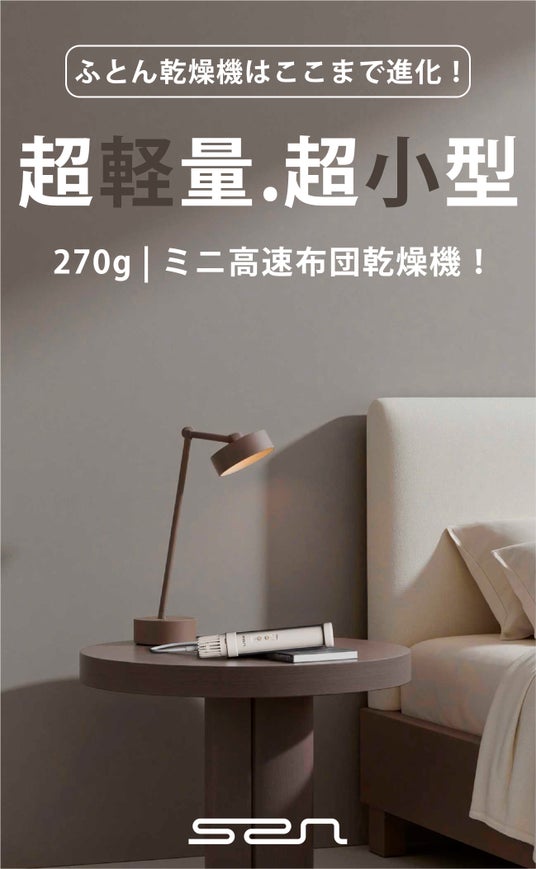 SUPWERπ独自の超小型高速モーター搭載で、重さわずか270gの超軽量設計。長さ26.5cmのコンパクトサイズで、カバンやスーツケースにすっぽり収まり、旅行や出張先でも布団や寝袋をサッと温め、快適な睡眠をサポートします。