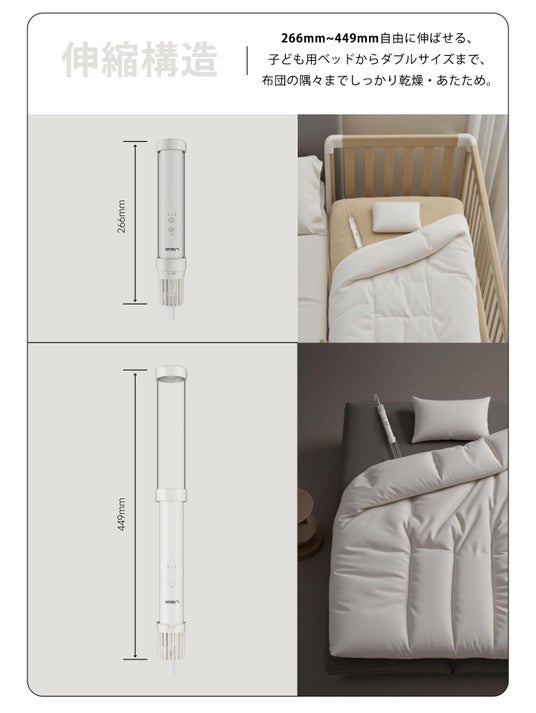 266mmから最大449mmまで伸ばせるので、子ども用ベッドからダブルサイズまで、布団の隅々までしっかり乾燥・あたためます。