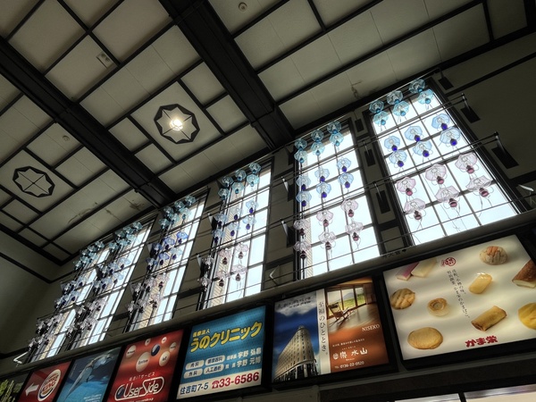 小樽駅に向かう電車はほぼ満員。といってもギュウギュウなわけではなく、席は全部埋まっていてつり革を持っている人が数人いるくらいの込み具合。ベビーカーを押す家族連れや外国人観光客の姿も多く見られました。