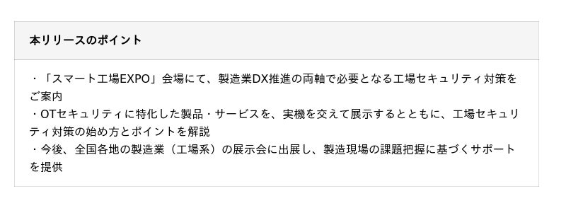 KELグループは、製造業のお客様に対するネットワーク・セキュリティ分野の豊富な実績とノウハウを活かし、OTとIT双方の特性を踏まえたセキュリティ対策をご紹介し、製造現場の安全性向上に寄与すべく、このたび出展を決定しました。