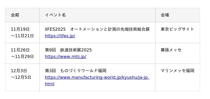 製造業DXの推進とセキュリティ対策の両立が求められる中、KELは全国各地の製造業ご担当者に最適なソリューションをご紹介するため、以下のとおり展示会への出展を計画しています。ご来場者様と直接お会いする機会を通じて、製造現場特有の課題をお伺いすることで、より良いご提案とサポートに努めてまいります。