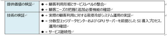 2025年11月頃から約6ヶ月にわたり、液浸冷却システム「KAMUI」を活用したAI基盤導入・運用検証に向けたPoCを実施する予定です。今回は主に以下の項目を検証し、その結果をもって新サービスの本格的な開発・提供へと移行します。