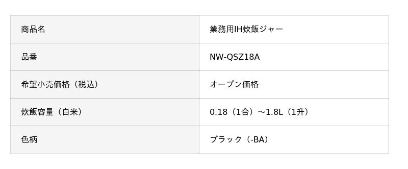 象印マホービン株式会社は、鈴茂器工株式会社(本社:東京都中野区、代表取締役社長:谷口徹、以下「鈴茂器工」)と共同開発した1升炊きの業務用IH炊飯ジャー(NW-QSZ18A)を2026年4月1日より発売いたします。本製品は鈴茂器工が販売およびアフターサービスを行うオリジナル商品です。