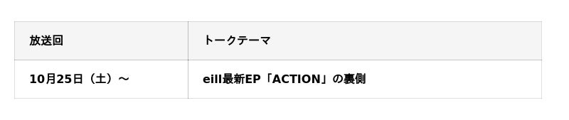 後半は、Ryo’LEFTY’Miyataが6曲中5曲をプロデュースした、eillの最新EP『ACTION』の制作の裏側を振り返ります。トークでは、EPタイトル『ACTION』誕生の背景や、eillの楽曲が海外で広がりを見せる理由、さらにはツアー同行時のエピソードなど、Ryo’LEFTY’Miyataだからこそ語れる貴重な話が満載です。