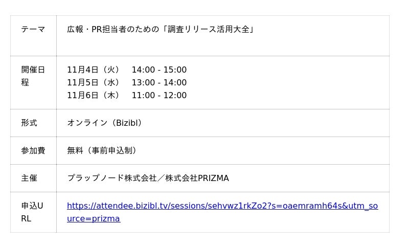 広報DXを支援するプラップノード株式会社と、PR支援で1,000社超の実績を持つ株式会社PRIZMAは、2025年11月4日(火)より3日間【広報・PR担当者向けオンラインセミナー「調査リリース活用大全」】を開催します。