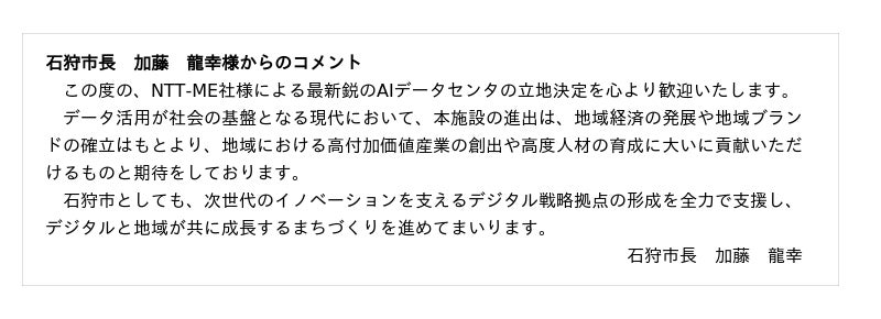 このことからNTT-MEとしても、石狩エリアが今後もデータセンタの誘致や集積が期待され、需要家も集まりやすく、事業者間の協業やIOWNの提供などを通じた収益化が見込めるエリアと期待し、本事業の第一弾として手掛けることといたしました。