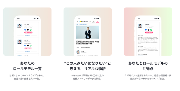 talentbook株式会社は10月16日に、就活・転職において1万以上のロールモデルの中から自分に適した"憧れの先輩"を発見できるという「ロールモデル診断」のリリースを発表した。経歴や価値観に関する質問に答えることで、AIがロールモデルを提案し、「この人のように働きたい」と思える先輩との出会いを創出するという。