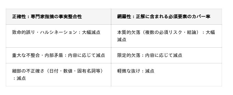 専門家指摘事項を正解とし各LLMでの出力を以下の基準にて採点。