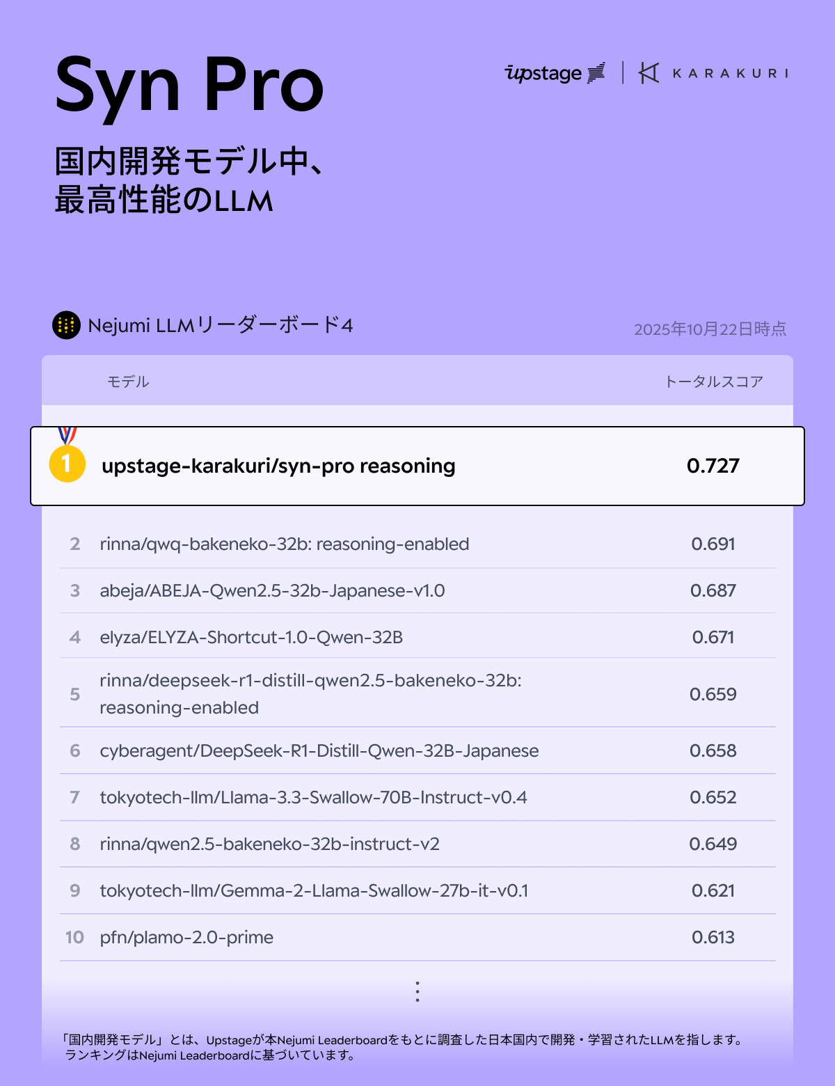 2025年10月23日、東京 - Upstage AI 株式会社(以下、Upstage)は、日本のAIの未来を切り拓く新たな一歩として、次世代型の日本語大規模言語モデル(LLM)「Syn Pro(シン・プロ)」を発表しました。本モデルは、日本のAI開発をリードするカラクリ株式会社と共同で国内開発されたものです。