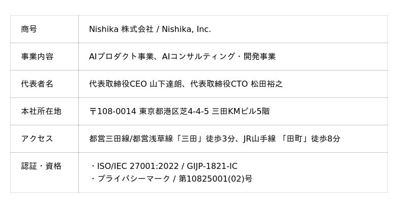 Nishikaは「テクノロジーですべての人が誇りを持てる社会を」をビジョンに掲げ、企業の生産性を高める新たなデータ資産創出に取り組んでいます。 中でも、SecureMemo/SecureMemoCloudを通じて「企業の会議を全てデータ化する」ことをプロダクトビジョンとしており、日本のビジネス会議における会話情報を精度高く記録・構造化することで、付加価値の高い情報活用を実現することを目指しています。