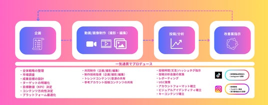 当社はこれまでのSNSアカウントの運用経験から、「企画→制作(撮影・編集)→投稿/分析→改善提案」までをワンストップで回す運用体制を確立しています。