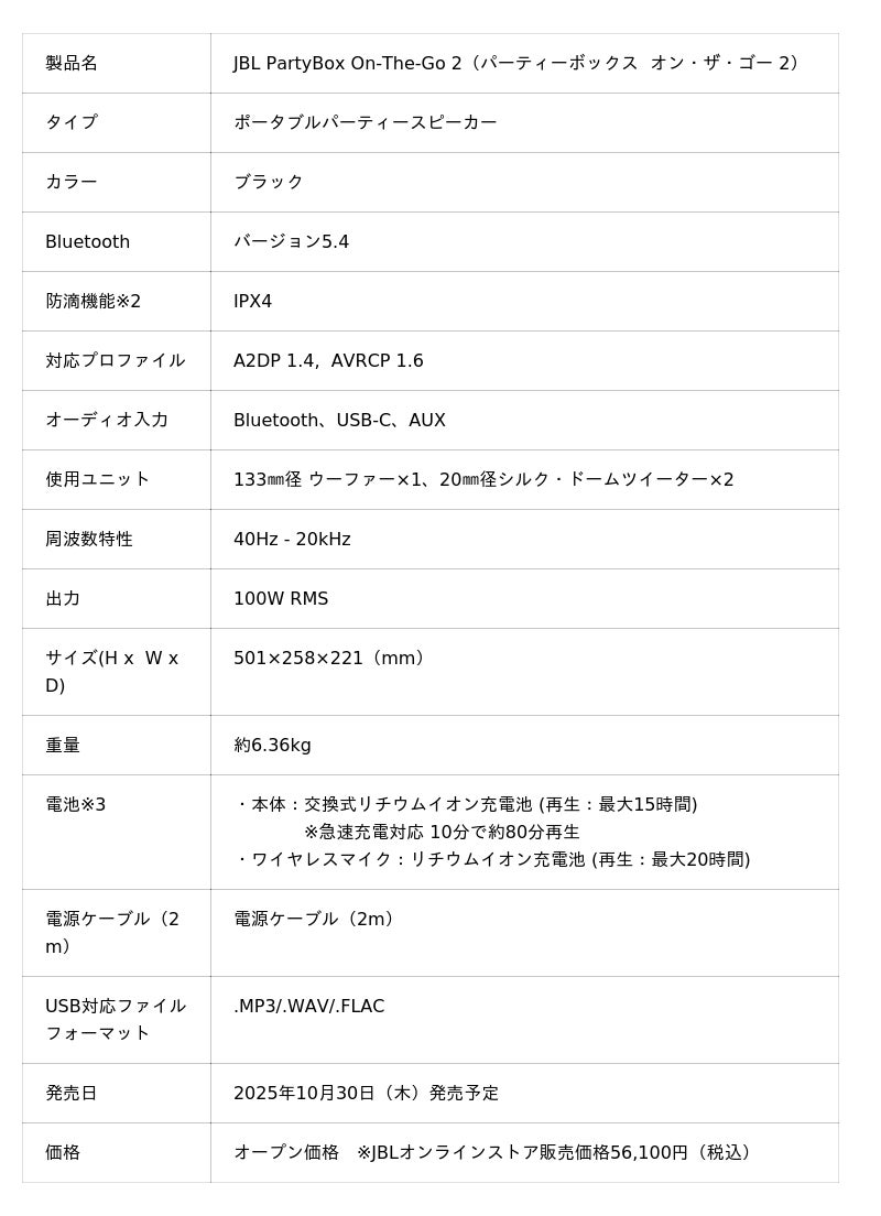 ハーマンインターナショナル株式会社(本社:東京都千代田区、代表取締役:桑原拓磨)は、アメリカ カリフォルニア発祥の世界最大級のオーディオブランドであり、日本においてワイヤレススピーカー7年連続販売台数No.1※1に輝く「JBL」より、デジタルワイヤレスマイクを付属し、パワフルなJBLプロ・サウンドをポータブルで楽しめるパーティースピーカー「JBL PartyBox On-The-Go 2(パーティーボックス オン・ザ・ゴー 2)」を2025年10月30日(木)より発売いたします。