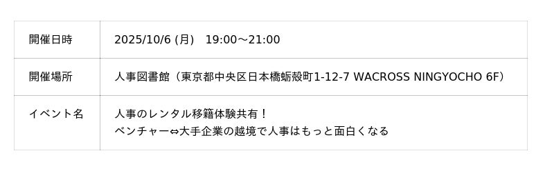 株式会社Trustyyle(本社:東京都中央区・代表取締役:吉田洋介)は、2025年10月6日に対面イベント「人事のレンタル移籍体験共有!ベンチャー⇔大手企業の越境で人事はもっと面白くなる」を運営するコミュニティ「人事図書館」にて開催しました。当日は、レンタル移籍を実際に経験した人事担当者が登壇し、組織の枠を越えて挑戦する「越境」の学びや効果を語りました。本記事では、イベント当日の様子や成果についてご報告します。