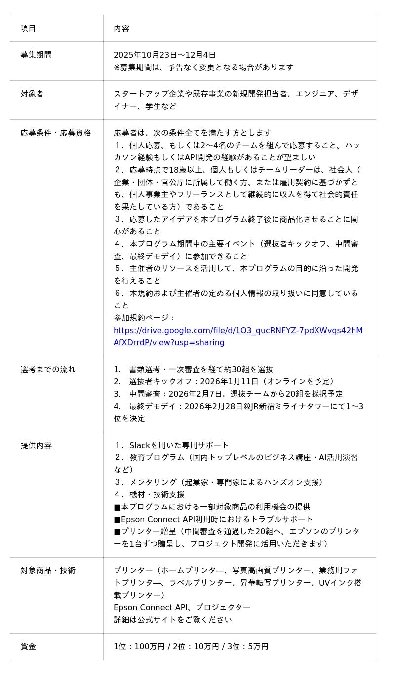 本プログラムを通じて、エプソンは共創による新規事業創出を加速させ、社会課題の解決に貢献するビジネスモデルの構築を目指します。参加者の皆さまと協働しながら、技術の可能性を広げ、持続可能な社会の実現に向けた取り組みを推進していきます。