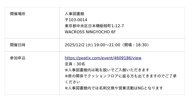2024年4月1日に東京人形町にオープンした、人事関連職が集まるコワーキング×コミュニティ。2500冊以上の人事に関する書籍と700名以上の会員を有しており「仲間と学びで、未来を拓く」をタグラインに運営しています。