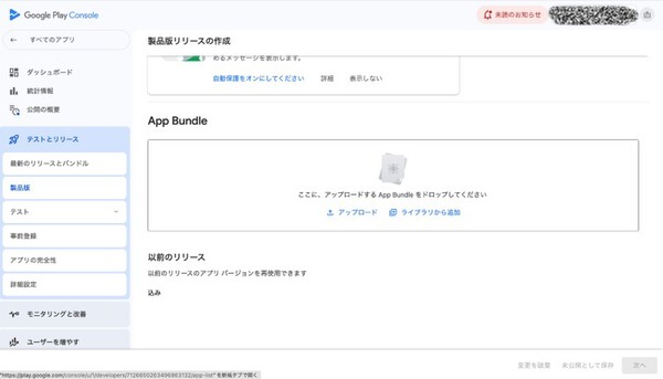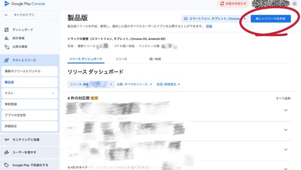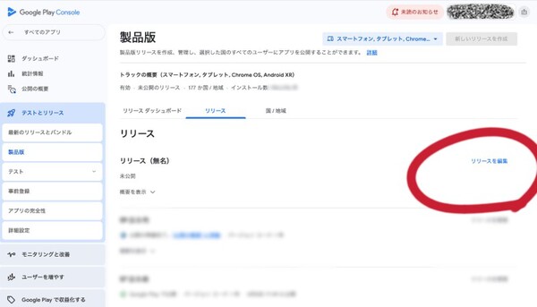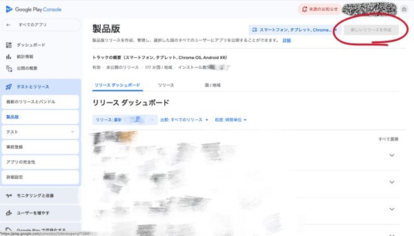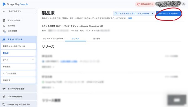 左メニュー「テストとリリース」→「製品版」→「新しいリリースを作成」