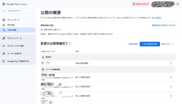 以下の画像は、審査が完了しているものの、公開期日が決まっており、手動公開作業を後程実施予定のため、【7件の変更を公開】が活性状態になっています。