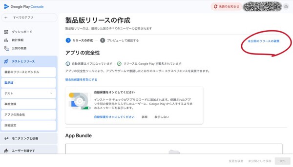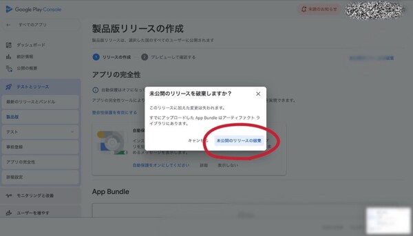 【製品版リリースの作成】の【未公開リリースの破棄】を押します。