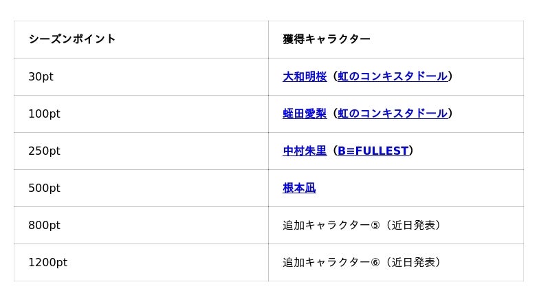 シーズンポイントを貯めた後にシーズンパスを購入すると、追加キャラクター第一弾の 大和明桜(やまと あお)、蛭田愛梨(ひるた あいり) に加え、本日第二弾として登場する 中村朱里(B≡FULLEST)、根本凪 のキャラクターを獲得できます。