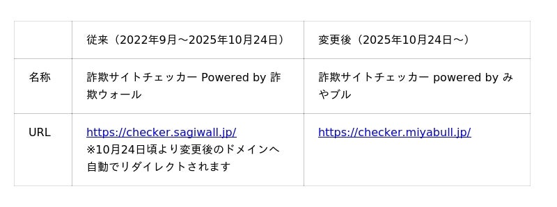詐欺サイトチェッカーは本日2025年10月24日(金)に名称とドメインを下記の通り変更いたしました。なお、チェック機能や画面は従来のサービスから変更なく、これまで通り利用頂けます。
