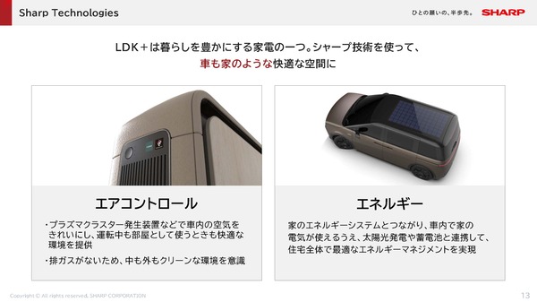 このLDK+は、保有時間の多くを待機に費やしているクルマに対し、暮らしとEVが融合していくという、シャープが目指す世界観を具現化するものです。シャープ独自のAI(人工知能)やAIoT(AIとIoTの技術)、さらにはエネルギーソリューションなどの技術を結集させ、既存の自動車メーカーでは対応しづらい領域、すなわち「車内空間を優先」とした新しい価値の提供を目指すとしています。
